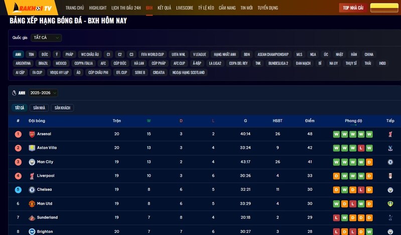 Tại Ra Khoi TV, bảng xếp hạng bóng đá anh hiển thị đầy đủ: